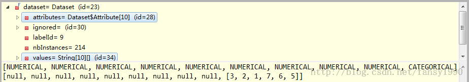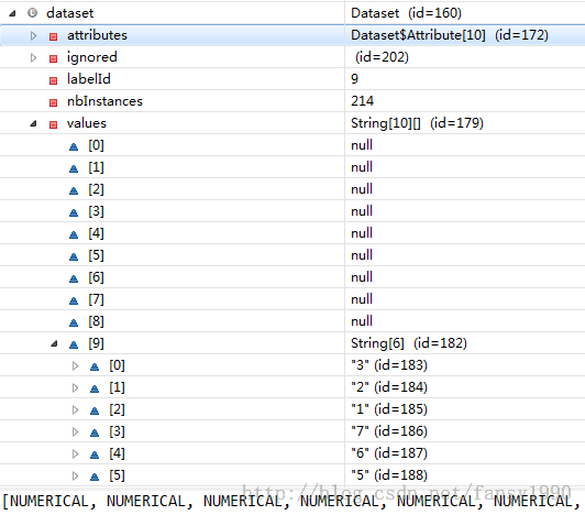 第一步是把descriptor转换为全拼,如下:[IGNORED, NUMERICAL, NUMERICAL, NUMERICAL, NUMERICAL, NUMERICAL, NUMERICAL, NUMERICAL, NUMERICAL, NUMERICAL, LABEL];第二步采用parseString方法去遍历所有的输入文件,看输入文件是否满足descriptor的描述,是则把行数加1,即样本数加1(glass.data的数据,size为214,符合原始数据的样本数);第三步是把标识全部取出来放入values中,values中的值为:[null, null, null, null, null, null, null, null, null, null, [3, 2, 1, 7, 6, 5]]至于values中的最后一个表示标识的为什么不是[1,2,3,5,6,7],是因为在parseString方式中这里的set是HashSet,采用随机存放的方式。该方法返回: