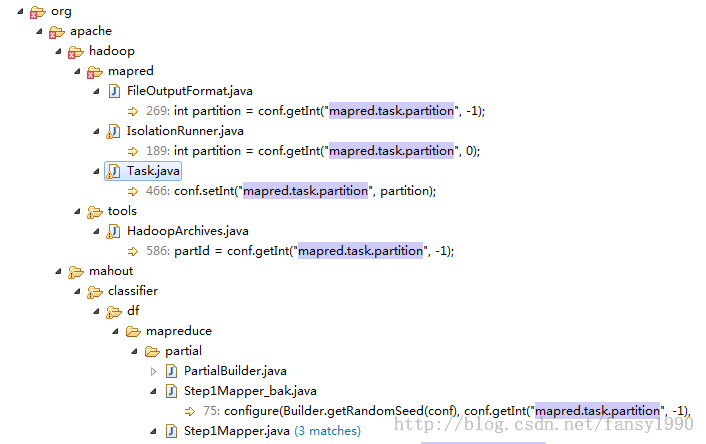 所以得到的结论就是Job提交之前conf没有设置mapred.task.partition的值,但是刚提交,在Mapper的第一个运行函数setup中就可以读取conf的mapred.task.partition的值了,这是神马情况?难道其他地方还有设置这个值的?好吧,我搜搜看: