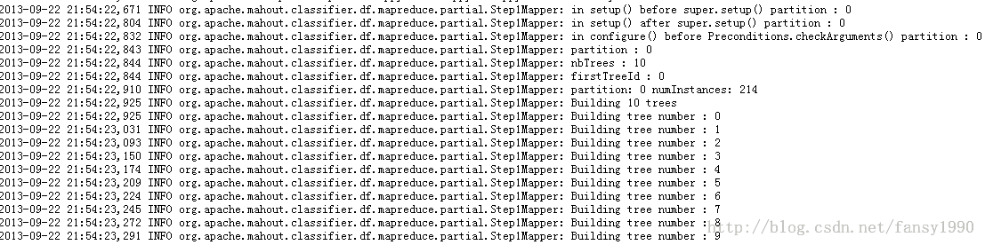 13/09/21 23:53:10 INFO common.AbstractJob: Command line arguments: {--dataset=[hdfs://ubuntu:9000/user/breiman/glass.info], --endPhase=[2147483647], --input=[hdfs://ubuntu:9000/user/breiman/input/glass.data], --nbtrees=[10], --output=[hdfs://ubuntu:9000/user/breiman/output-forest], --selection=[5], --startPhase=[0], --tempDir=[temp]} 13/09/21 23:53:11 INFO mapreduce.Builder: partition : -1 13/09/21 23:53:11 INFO mapreduce.Builder: Configuring the job... 13/09/21 23:53:11 INFO mapreduce.Builder: Running the job...