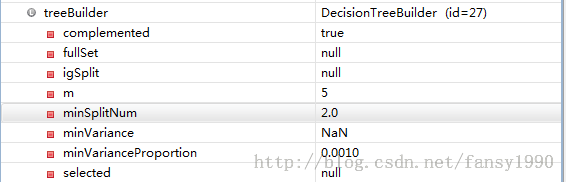 1. 新建treeBuilder,设置每次随机选择属性的样本个数,默认是所有属性的1/3,设置complemented,默认是true的,其他的属性参数基本也是默认的,设置断点,可以看到该变量的值如下: