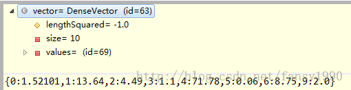 假如我传入的字符串是:[1,1.52101,13.64,4.49,1.10,71.78,0.06,8.75,0.00,0.00,1],那么convert函数首先使用逗号把字符串解析到数组中,然后根据ignored的值把数组中对应的下标的值忽略,再次根据attributes的值进行匹配,如果是Numerical的话直接把值加入vector中,如果是categorical的话就按照values里面的数组进行匹配,比如如果是字符串“3”的话,那么就把其下标值加入vector中,比如上面的数据是1,那么加入字符串中的值就是2。可以通过debug方式查看添加这行输入后vector的值: