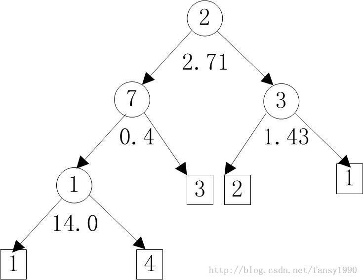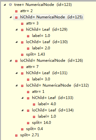 最后返回的childNode是什么? childNode = new NumericalNode(best.getAttr(), best.getSplit(), loChild, hiChild);可以看到这个childNode包含四个属性,第一个是属性attr,第二个是该属性的分水岭bestSplit,第三个是左子树,第四个是右子树。