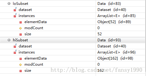 刚开始 Data loSubset = data.subset(Condition.lesser(best.getAttr(), best.getSplit())); Data hiSubset = data.subset(Condition.greaterOrEquals(best.getAttr(), best.getSplit()));这两句就是把所有数据按照属性bestAttr中的bestSplit来进行分组。若属性bestAttr中的值小于bestSplit的值,那么这条数据就被分给loSubset中,否则分给hiSubset中。debug模式查看这两个变量的值: