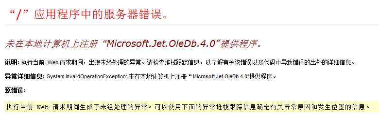 下载下来后,新建了站点,没想到文件夹权限什么的都不用设置,在IIS选用Classic .NET AppPool应用程序池,貌似因为不支持集成的……然后在选完数据库方式之后,提示【未在本地计算机上注册“Microsoft.Jet.OleDb.4.0”提供程序】然后上网查了查,发现我这是64位操作系统造成的: