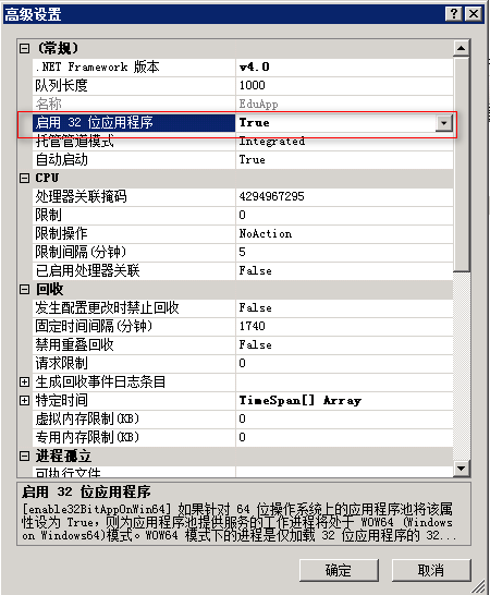 在应用程序对用的应用程序池的高级设置中设置“启用32位应用程序”为“True”