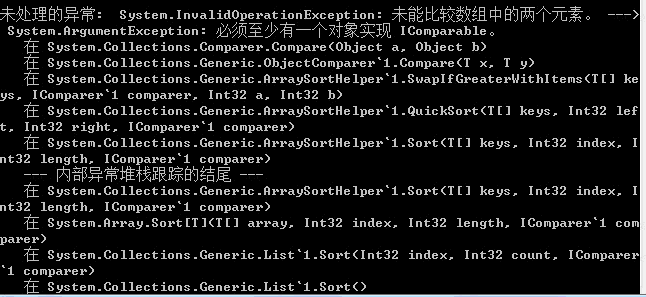 从图中的提示我们可以看出错误原因是由于进行比较的对象并未有任何一个实现IComparable接口,因此也就无法完成排序。事实上对于无参Sort()方法是使用Comparer.Default比较器来排序的,而此比较器进行比较时首先就会检查T是否实现了IComparable泛型接口,如果实现了则使用该实现。否则将坚持是否实现了IComparable接口。如果均未实现则引发InvalidOperationException异常。也就是说如果想使用此方法需要实现ICompara泛型接口或者IComparable接口