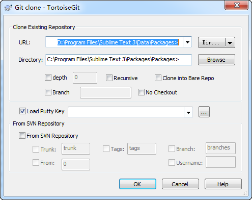 对于安装了 TortoiseGit 的朋友,在“我的电脑”或“计算机”中打开 D:Program FilesSublime Text 3DataPackages 文件夹,在空白处右击,选择 Git Clone...,弹出如下对话框:
