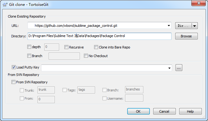 在URL中输入:https://github.com/wbond/sublime_package_control.git,在Directory中将路径修改为 D:Program FilesSublime Text 3DataPackagesPackage Control,如下图所示: