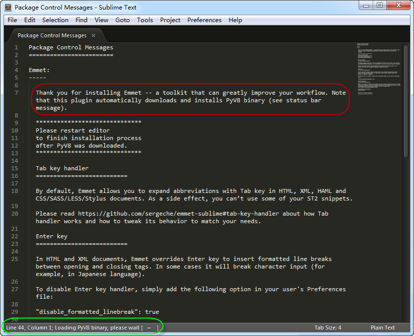 红框内的文字是说“这个插件会自动下载和安装 PyV8,请看状态条信息”,而左下角的绿色框内的提示就是正在下载、安装和载入 PyV8。