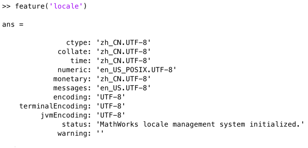 feature('locale') ans = ctype: 'zh_CN.US-ASCII' collate: 'zh_CN.US-ASCII' time: 'zh_CN.US-ASCII' numeric: 'en_US_POSIX.US-ASCII' monetary: 'zh_CN.US-ASCII' messages: 'en_US.US-ASCII' encoding: 'US-ASCII' terminalEncoding: 'UTF-8' jvmEncoding: 'US-ASCII' status: 'MathWorks locale management system initialized.' warning: 'Invalid locale name.'