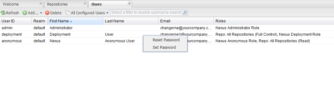 在Security-->Users中配置,在deployment用户上点击右键,选择Set Password,然后设置一个密码,做这个操作是为了后面提交做准备
