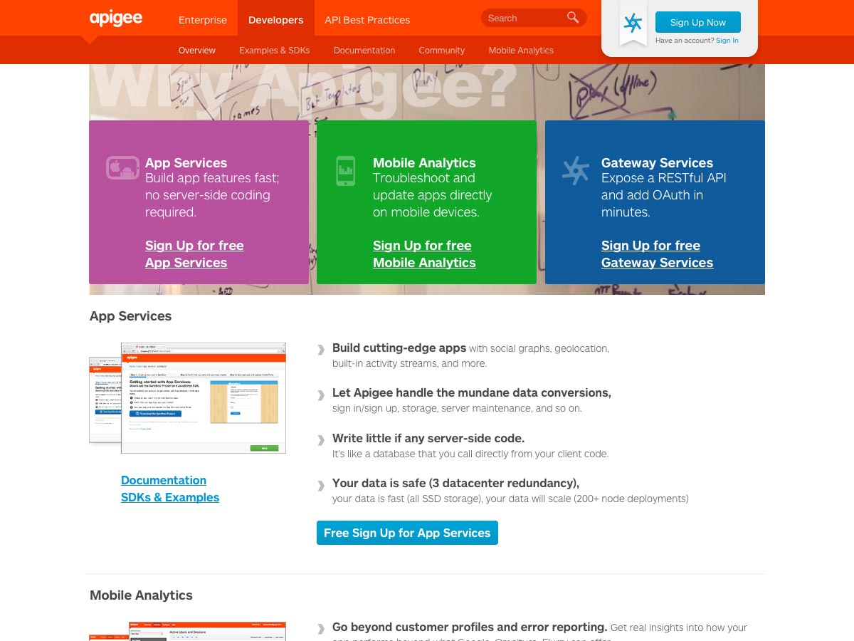 Apigee is a service for developers to more easily create cutting-edge apps. Apigee handles mundane tasks like sign ups/log ins, storage, and server maintenance, alongside plenty of other features.