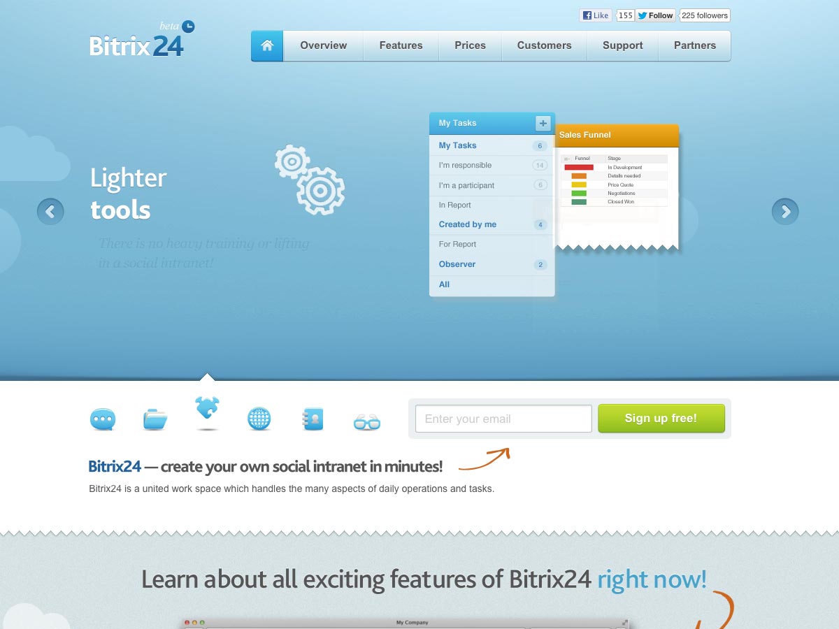 Bitrix24 makes it possible to create your own social intranet in just minutes. There’s a free account that supports up to 12 users and 5GB of files, while paid accounts add more users, more features, and more storage space.