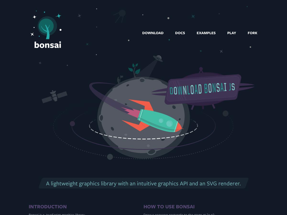 Bonsai is a lightweight JavaScript graphics library that includes an SVG renderer. It’s straightforward to use, and supports various multimedia assets (including audio, video, images, fonts, and more).