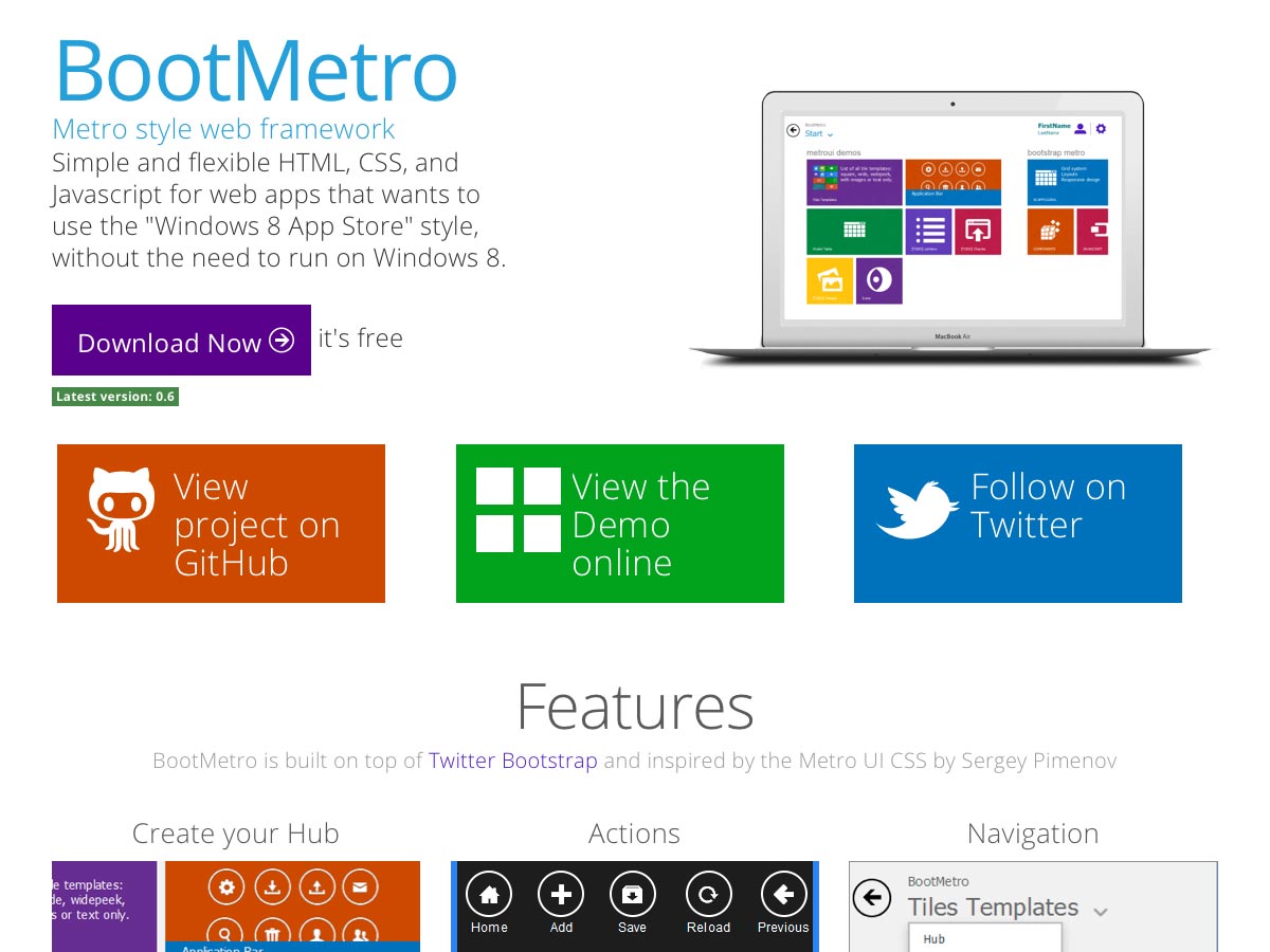 Boot Metro is a flexible, simple HTML, CSS, and JS framework for web apps with a Windows 8 App Store style. It’s open source and built on top of Twitter Bootstrap, and was inspired by Metro UI CSS.