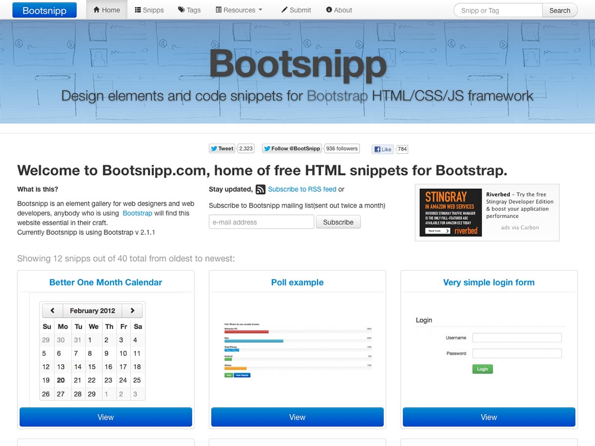 Bootsnipp is a gallery of free elements for designers and developers working with the Bootstrap HTML/CSS/JavaScript framework. There are currently 40 snippets included, with more being added.