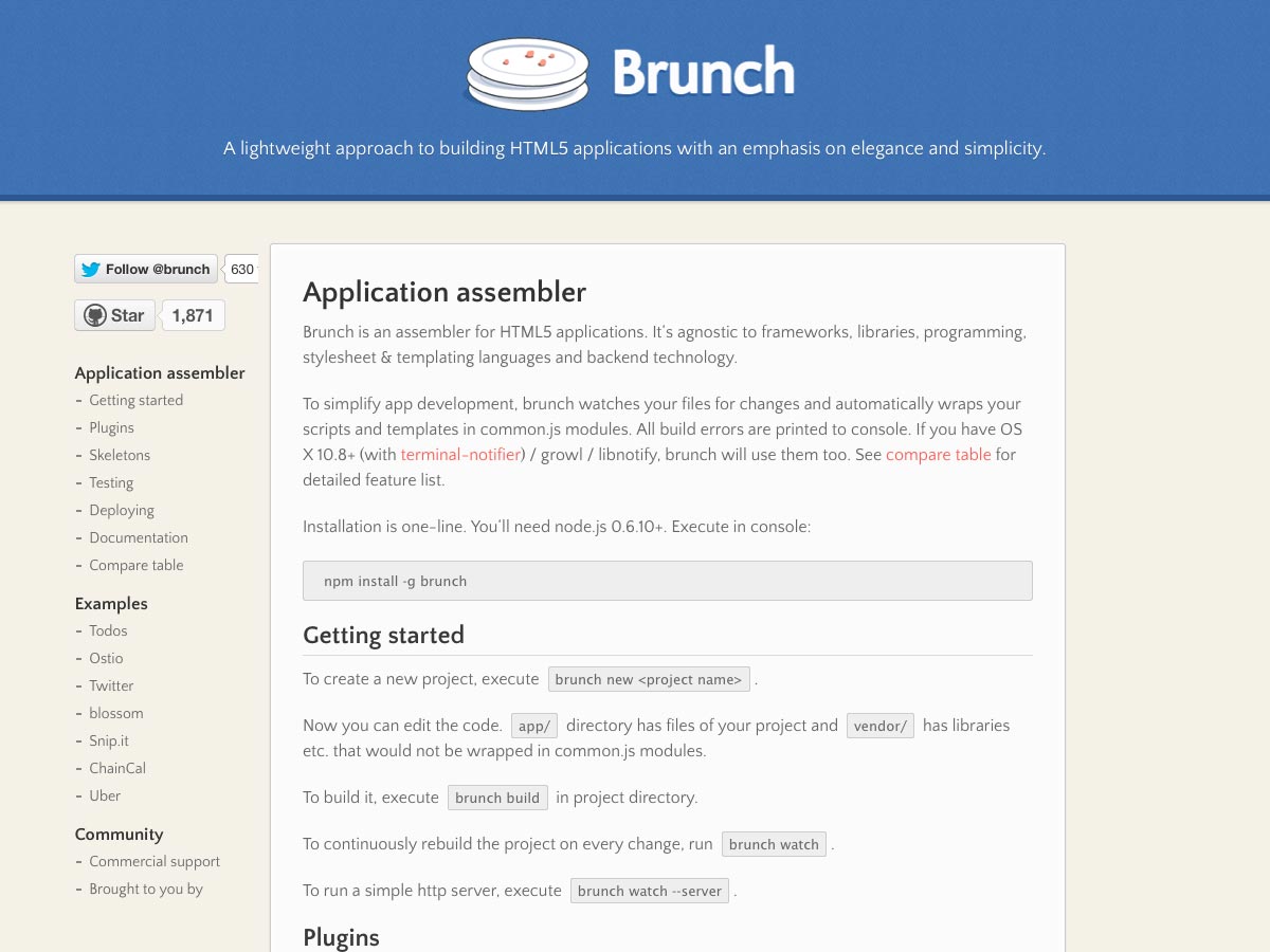 Brunch is an assembler for HTML5 applications. It can be used with any framework, library, programming language, stylesheet, templating language, or backend technology.