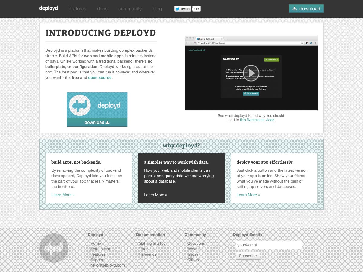 Deployd makes it easy to build APIs for web and mobile apps quickly. There’s no boilerplate or configuration, unlike traditional backends.
