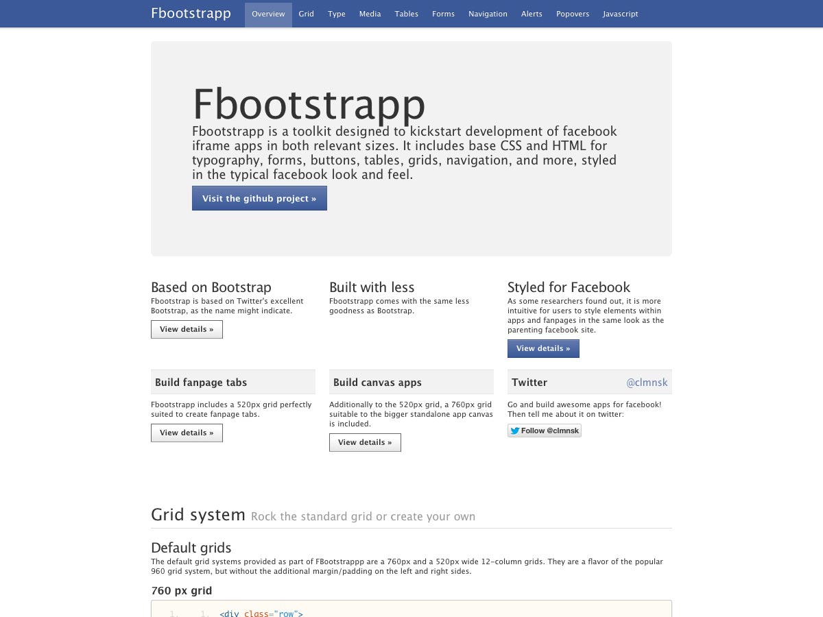 Fbootstrapp is a toolkit for building Facebook iFrame apps in both relevant sizes. It’s based on Bootstrap and built with Less, but styled for Facebook.