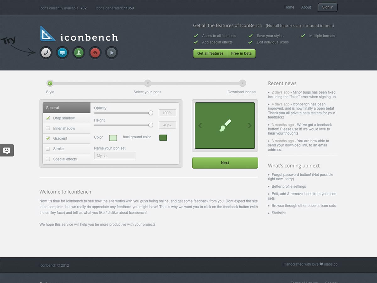 IconBench lets you customize a set of more than 700 icons. You can set things like opacity, drop shadow, inner shadow, gradient, and more, and then pick the icons you want.