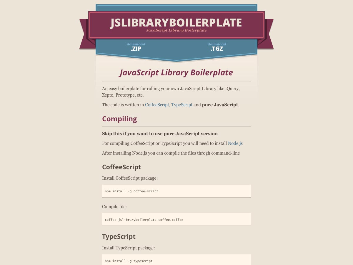 JS Library Boilerplate is an easy to use boilerplate for creating your own JS libraries (like jQuery or Prototype). It’s written in CoffeeScript, TypeScript, and pure JavaScript, and is thoroughly documented.