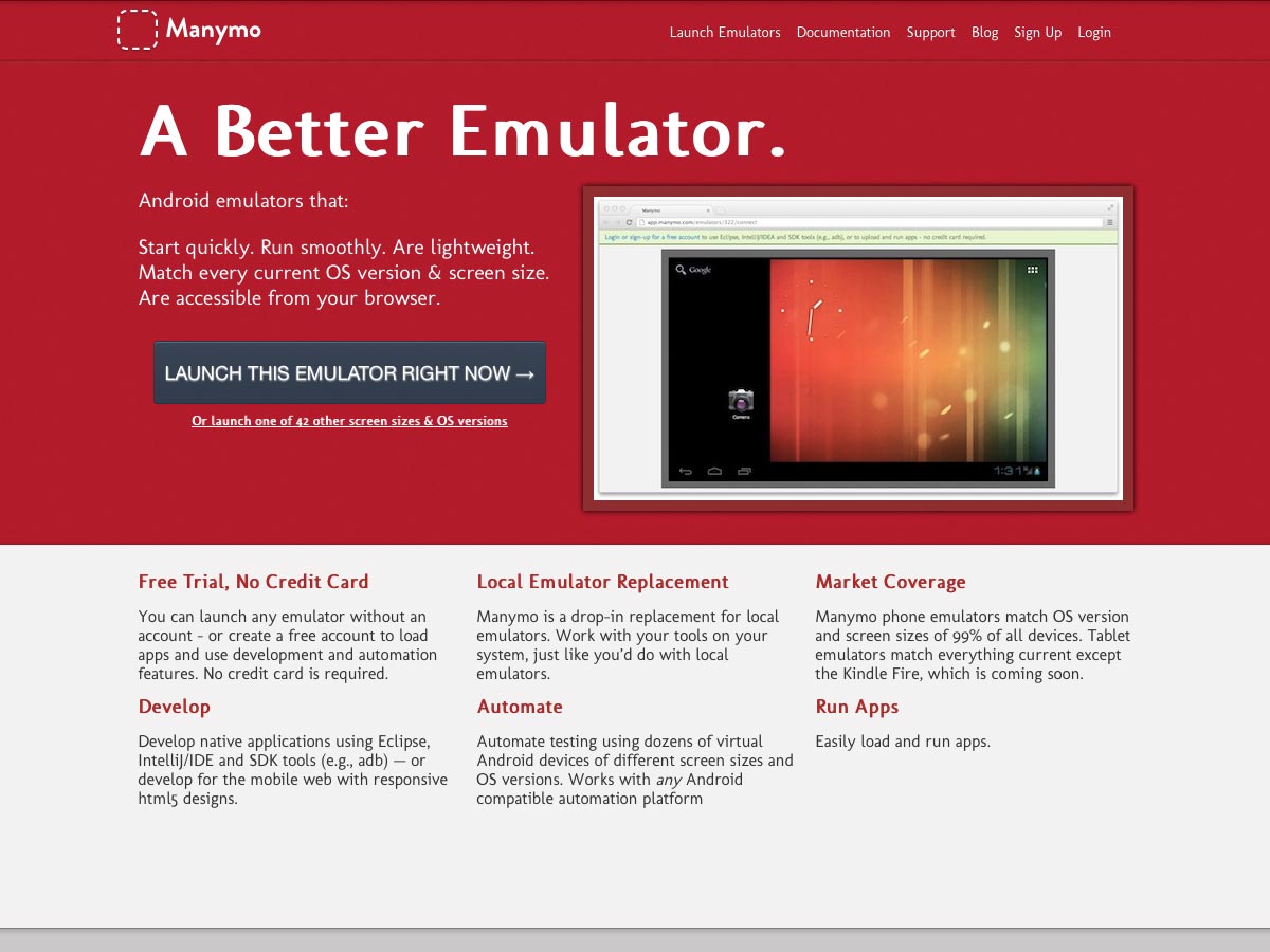 Manymo is an Android emulator that starts quickly and runs smoothly right in your browser, letting you test your Android apps. It supports more than 42 screen sizes and OS versions.