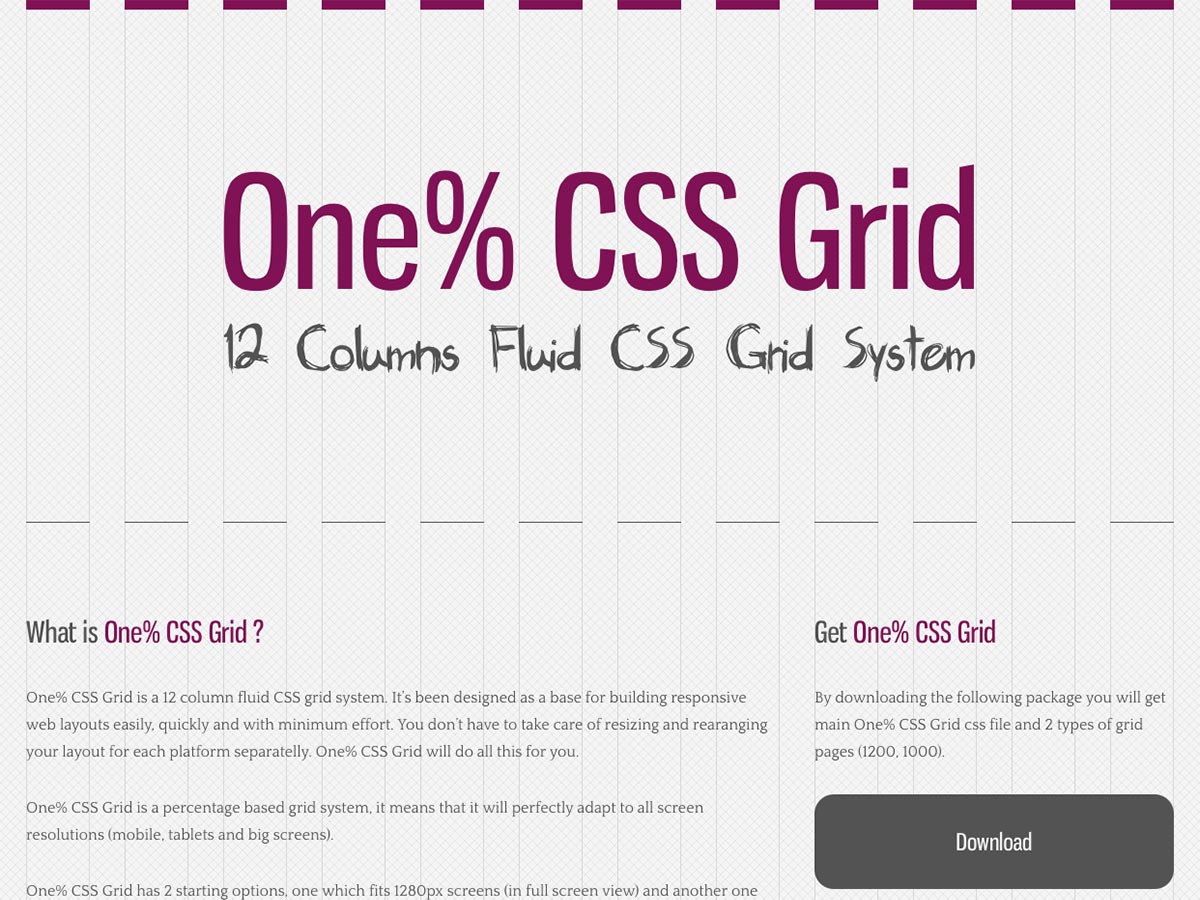 One% CSS Grid is a 12-column fluid grid system for building responsive layouts. It has two starting options, for screens of 1280px or 1024px wide, and uses a percentage-based grid system to perfectly adapt to any screen.