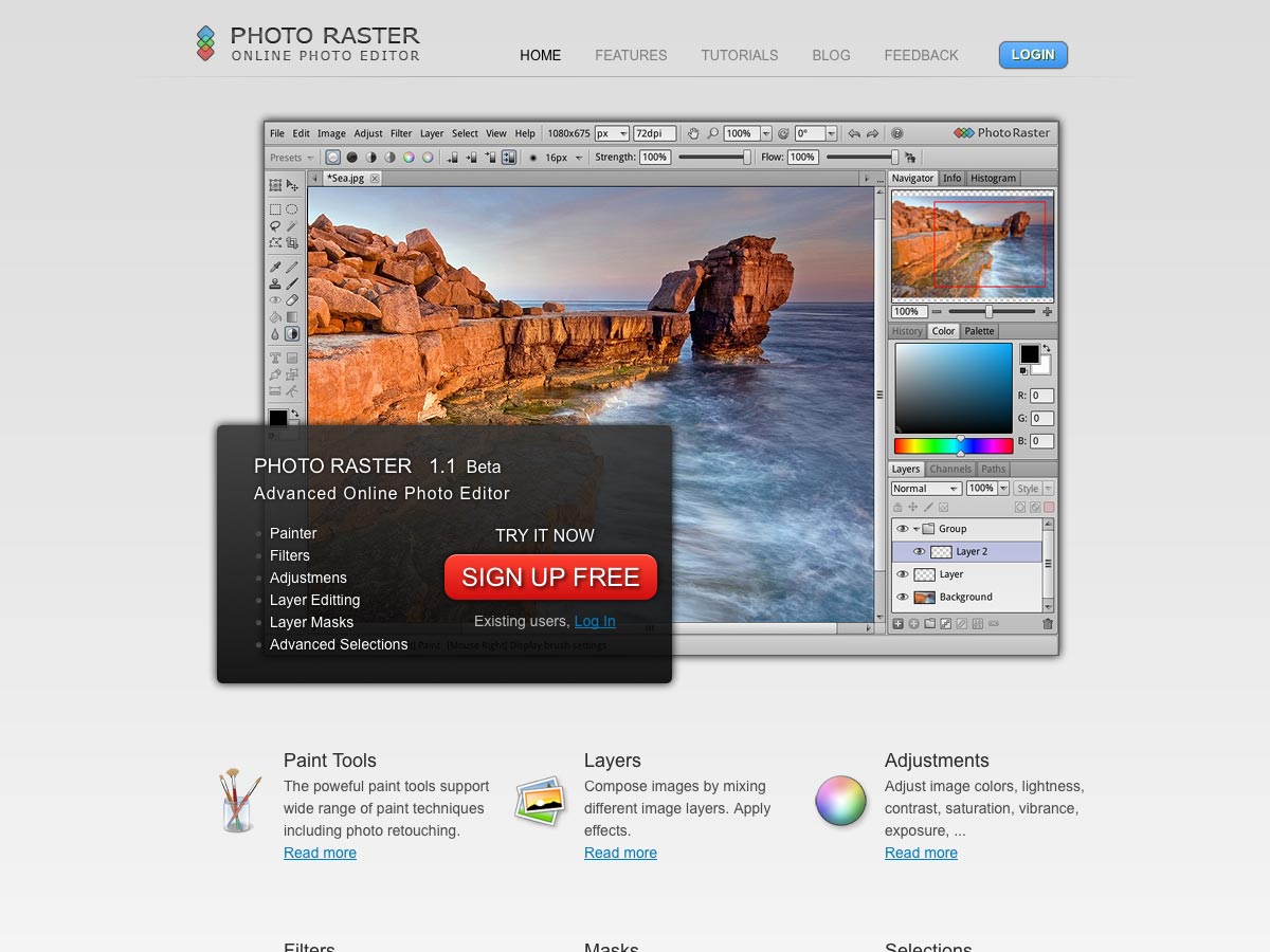 Photo Raster is an advanced online photo editor that includes tools for painting, filters, adjustments, layer editing and masks, and more.
