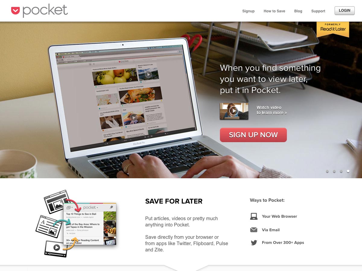 Pocket is an official Read it Later app that makes it easy to save articles, videos, or any other content for later. It works from your browser, email, and more than 300 apps, including Twitter, Pulse, Flipboard, and more.