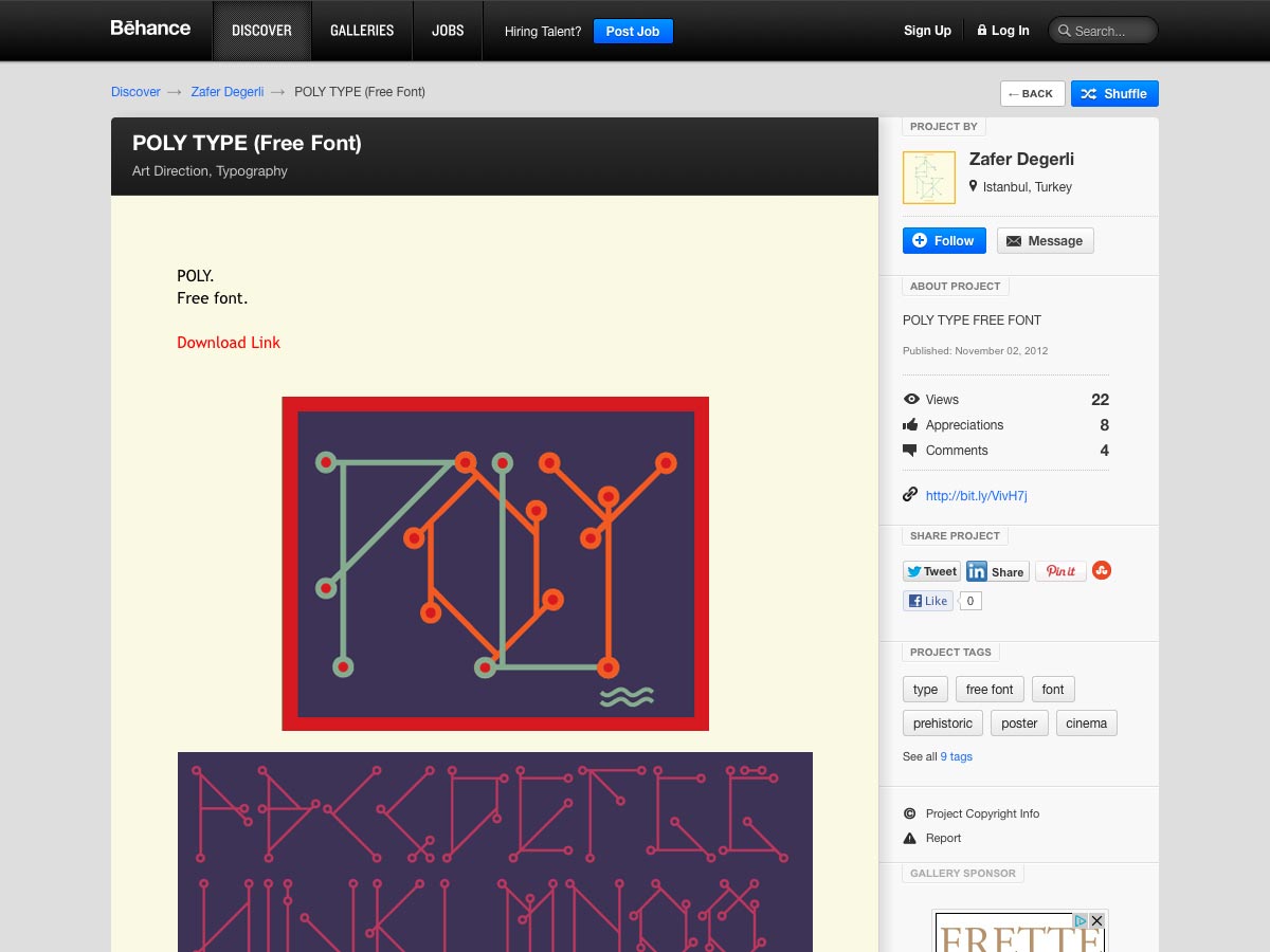 Poly is a free display font with geometric sensibilities. It’s great at large sizes and comes with a number of alternate characters.