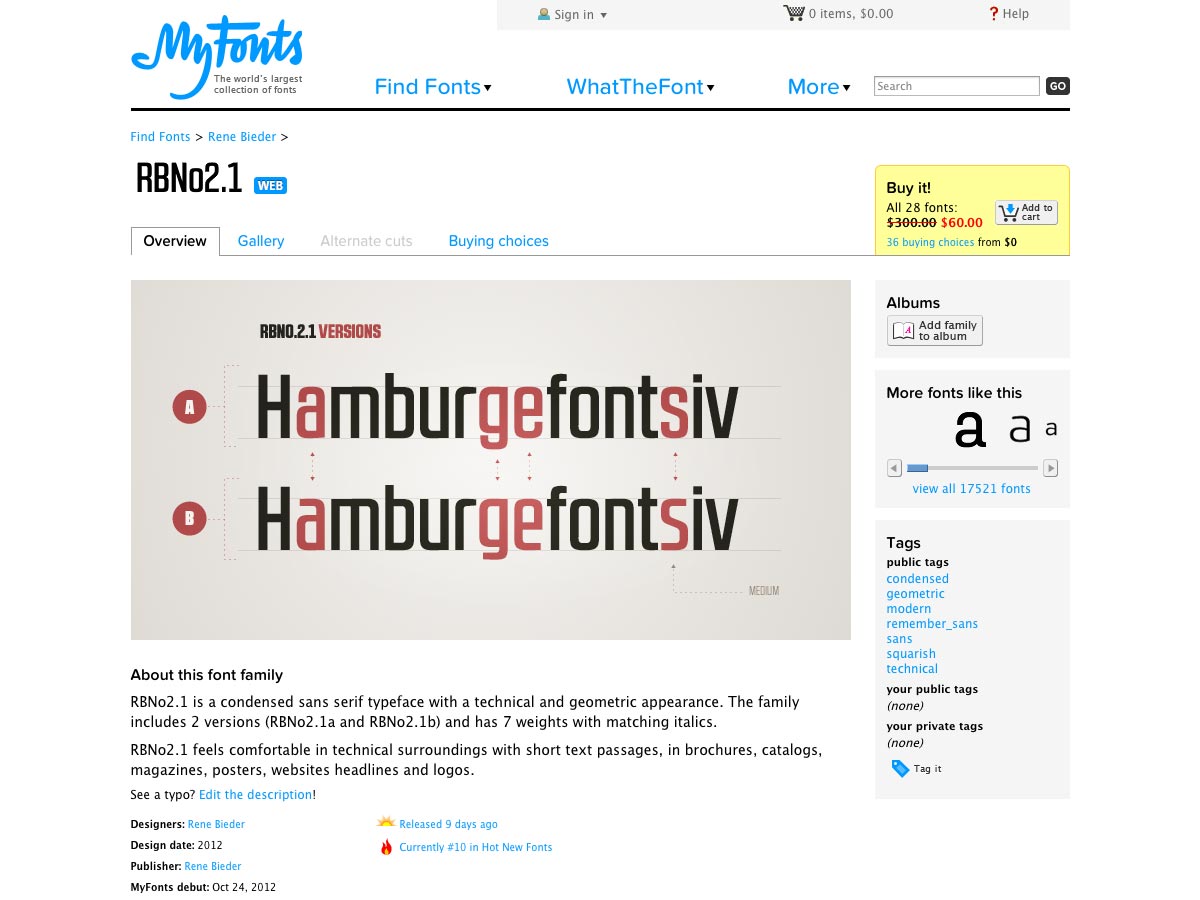 RBNo2.1 is a condensed sans-serif font with a geometric appearance and technical style. It has two versions in seven weights, with matching italics.