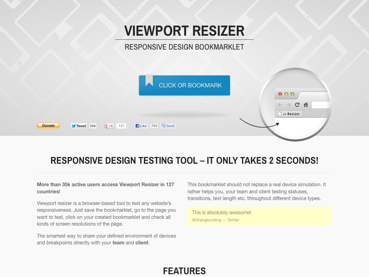 Viewport Resizer is a responsive design testing bookmarklet. All you have to do is go to the page you want to test, click the bookmarklet, and then view it in all kinds of screen resolutions.