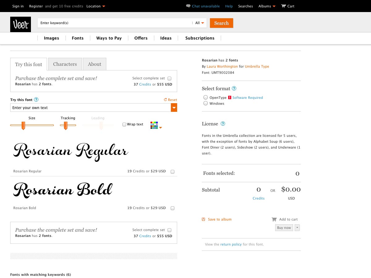 Rosarian is a brush-style script with thick, round shapes and variable line widths. It was designed by Laura Worthington, of Umbrella Type.