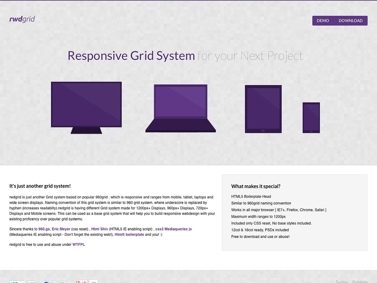 rwdgrid is a responsive grid system based on 960.gs. It has different grid systems for 1200px, 960px, and 720px displays, as well as mobile screens.