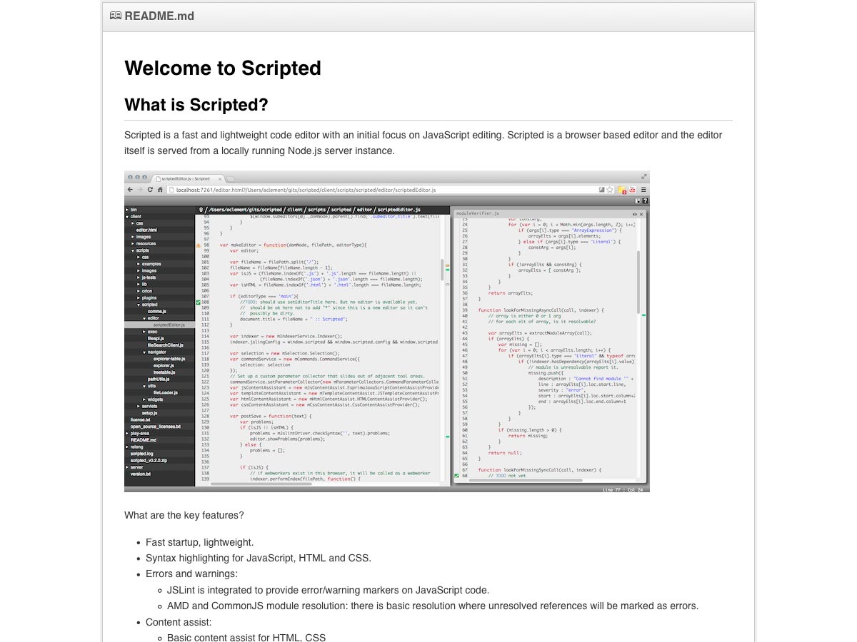 Scripted is a lightweight, fast code editor specifically for JavaScript. It’s browser-based and is served from a locally running Node.js server instance.