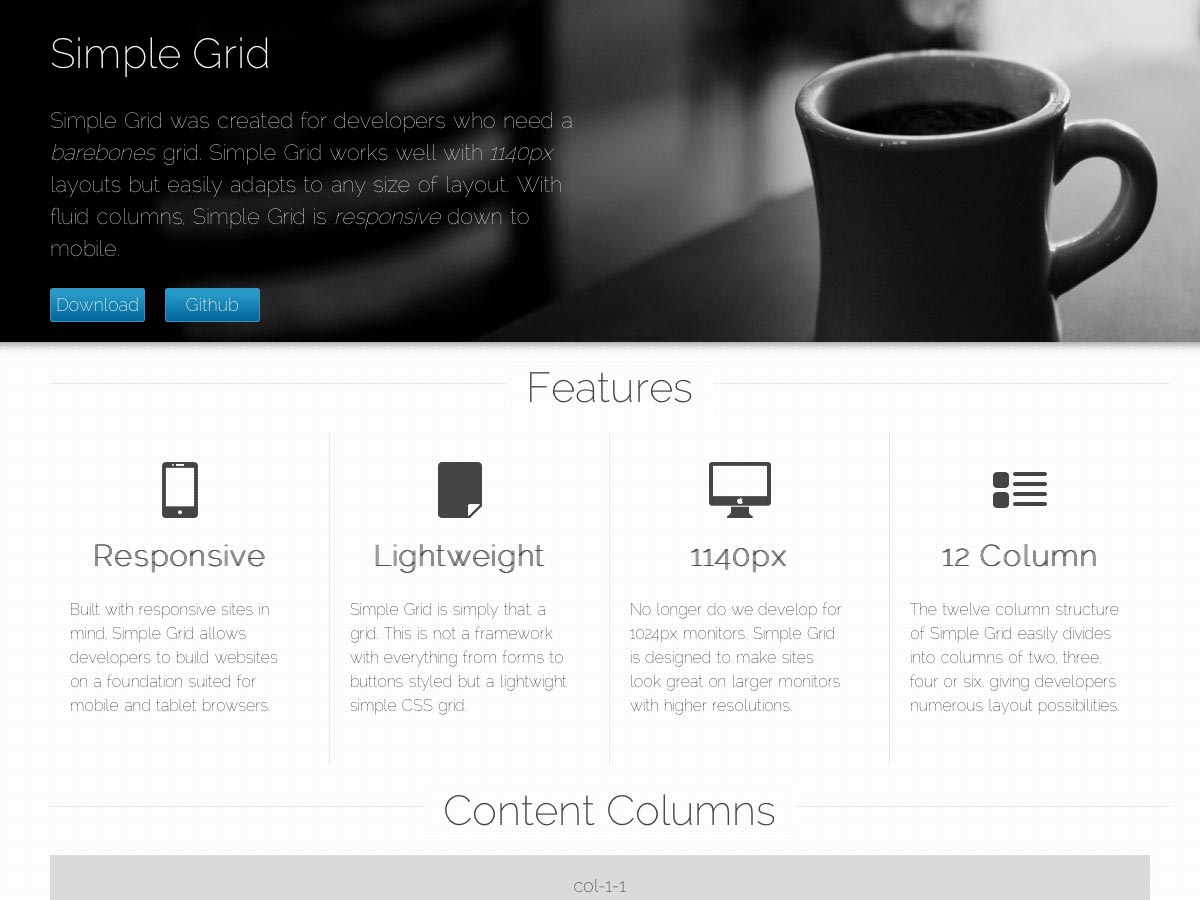 Simple Grid is a responsive, lightweight grid. It’s 1140px wide with twelve columns, but easily adapts to any size layout.