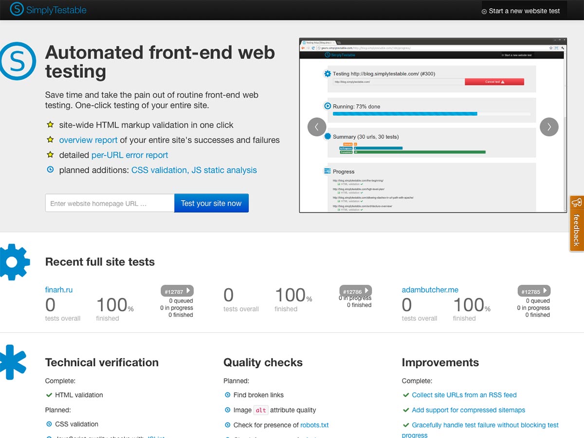 SimplyTestable is an automated front-end web testing app that allows for one-click testing of your entire site. It’ll validate your HTML markup, give you an overview report of your site’s successes and failures, a detailed per-URL error report, and more.