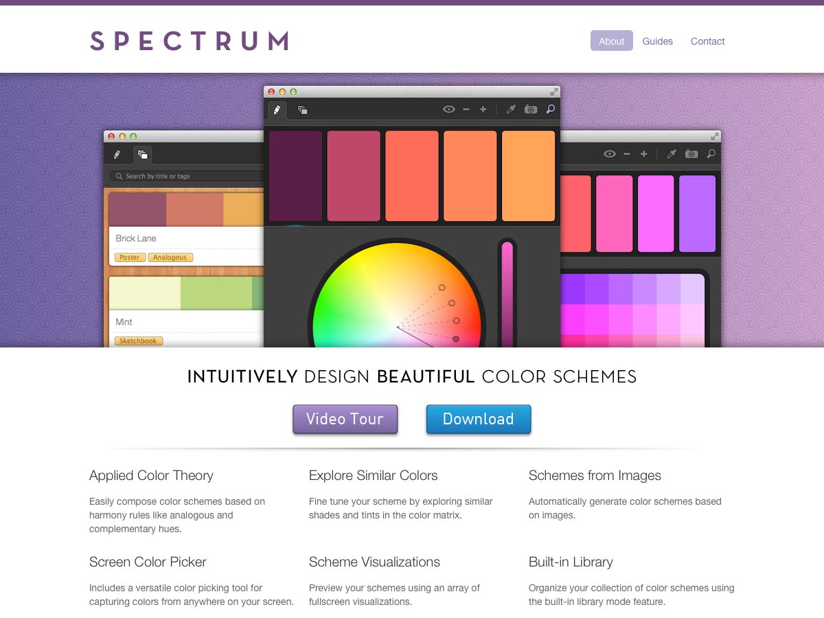 Spectrum is an OS X app that makes it easy for you to create color schemes intuitively. It uses built-in harmony rules for composing color schemes, as well as a color picker, a tool to make schemes from images, and built-in library, and more.
