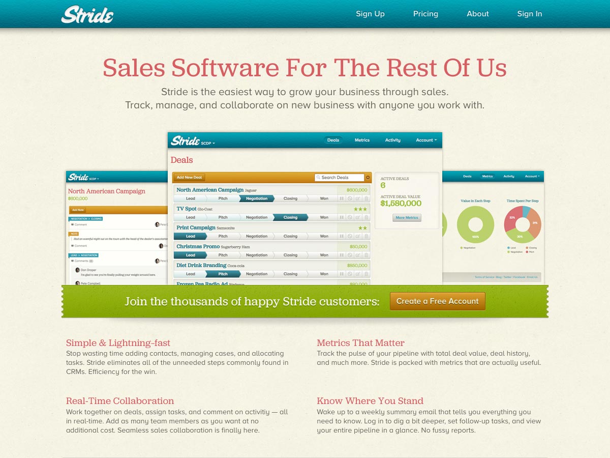 Stride is a sales management app that includes tools to track, manage, and collaborate on new business. It includes real-time collaboration tools to help your whole team work on deals, as well as useful metrics you actually care about.