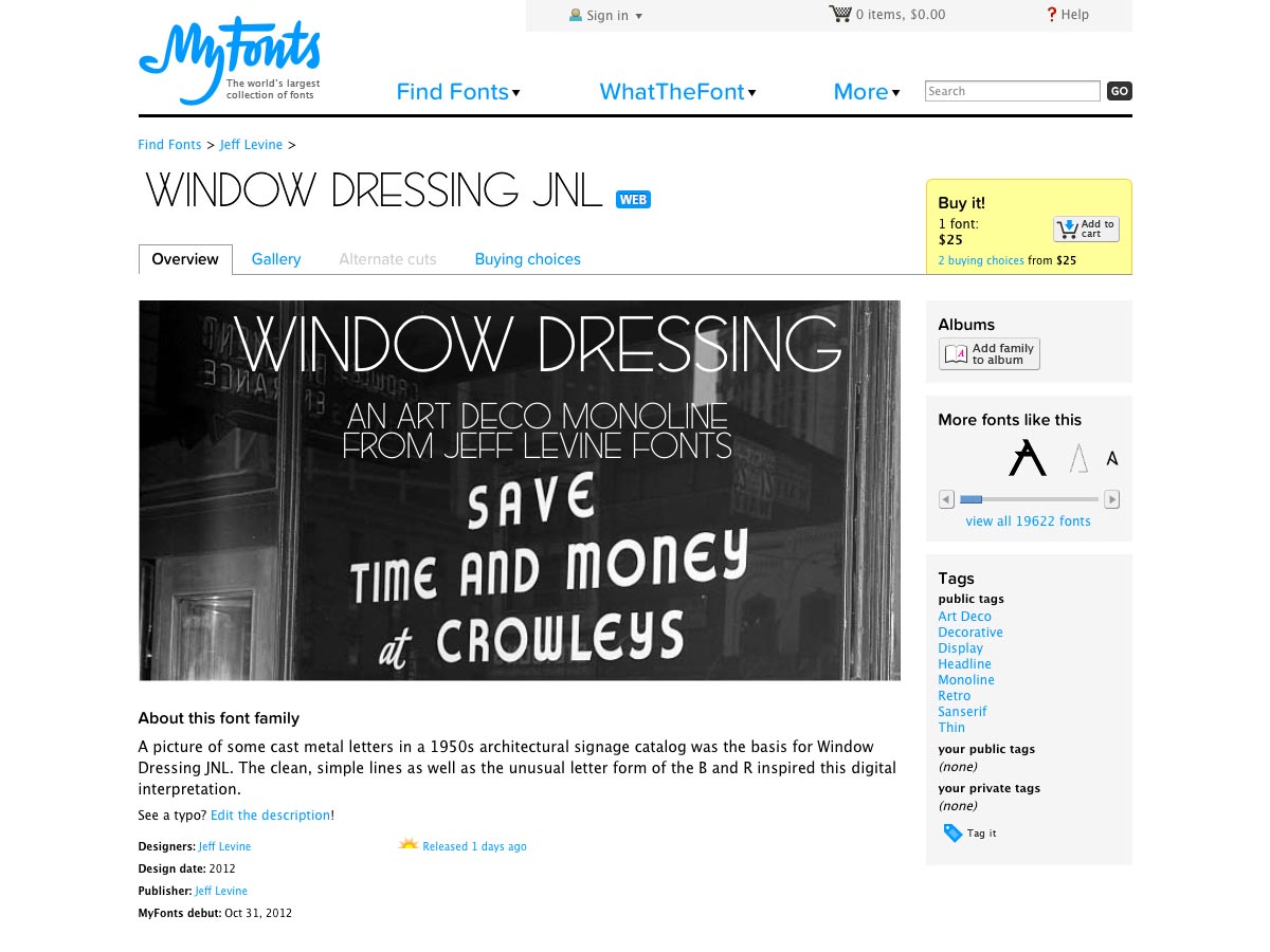 Window Dressing JNL is based on a picture of cast metal letters from the 1950s. It has clean, simple lines, and unusual letterforms for the B and R.