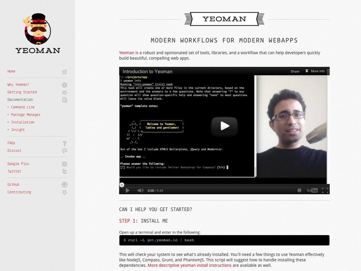 Yeoman is a robust set of tools and libraries, along with a workflow, for creating compelling, beautiful web apps. It includes thorough documentation, as well as a getting started guide.
