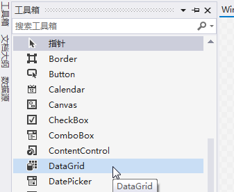 2) 在Visual studio 2013中的工具箱中,找到DataGrid控件,然后双击。把DataGrid控件添加窗体界面中。如下图1,图2。注意,图2中的红框所标示的那个小框,就是DataGrid控件,是不是与WindowForm中的DataGrid有很大的不同呀。
