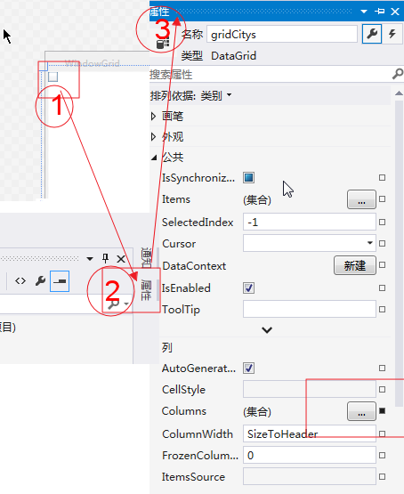 3) 给DataGrid添加列。先鼠标左键选中,窗体界面中的小方块,然后点击Visual Studio 2013最右边的“属性”标签,然后Visual Studio 2013会弹出“属性”编辑窗口。如下图。