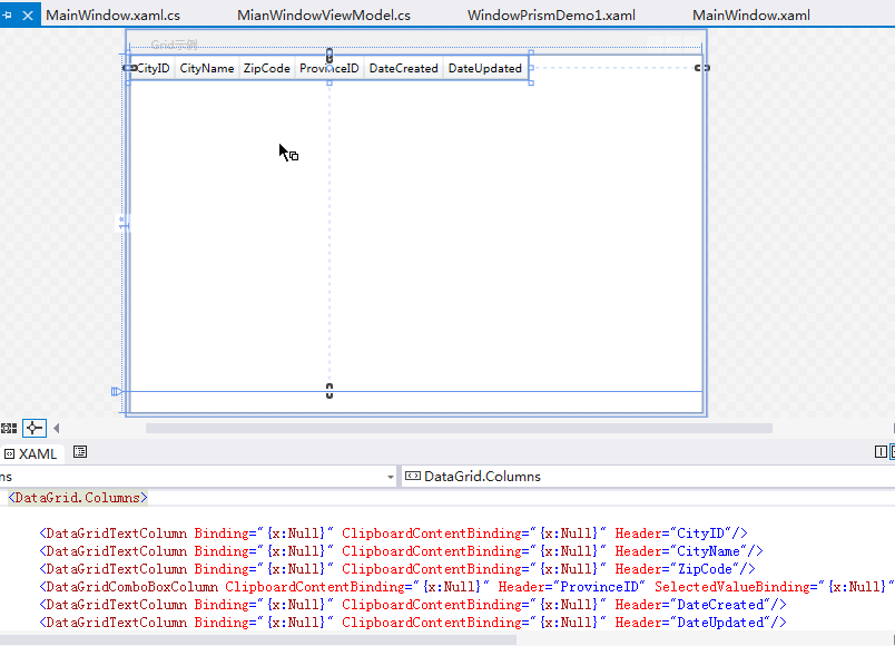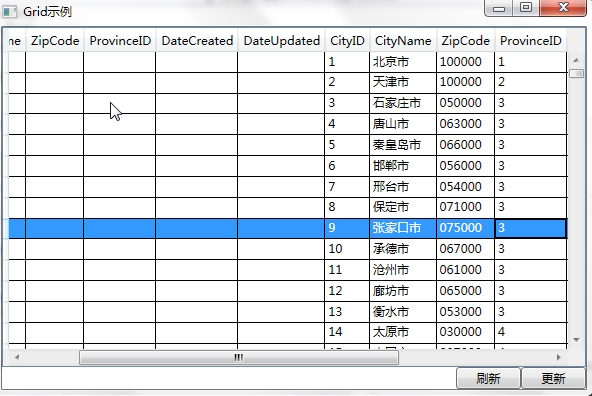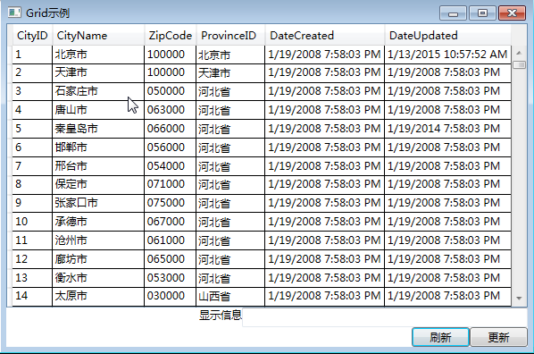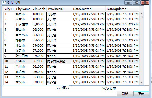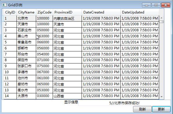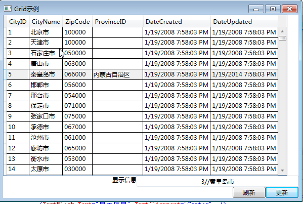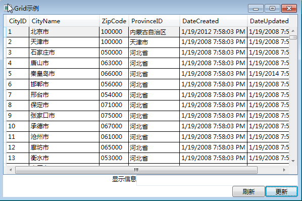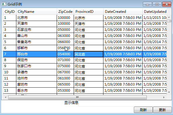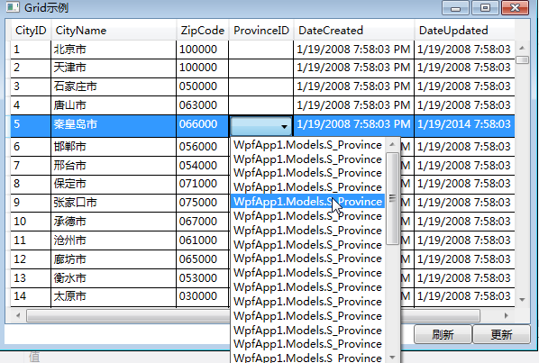 <Window x:Class="WpfApp1.WindowGrid" xmlns="http://schemas.microsoft.com/winfx/2006/xaml/presentation" xmlns:x="http://schemas.microsoft.com/winfx/2006/xaml" Title="Grid示例" Height="400" Width="600"> <Grid> <Grid.RowDefinitions> <RowDefinition Height="*"/> <RowDefinition Height="auto"/> <RowDefinition Height="22"/> </Grid.RowDefinitions> <DataGrid x:Name="gridCitys" Grid.Row="0" HorizontalAlignment="Left" VerticalAlignment="Top" AutoGenerateColumns="False"> <DataGrid.Columns> <DataGridTextColumn Binding="{Binding CityID}" ClipboardContentBinding="{x:Null}" Header="CityID"/> <DataGridTextColumn Binding="{Binding CityName}" ClipboardContentBinding="{x:Null}" Header="CityName"/> <DataGridTextColumn Binding="{Binding ZipCode}" ClipboardContentBinding="{x:Null}" Header="ZipCode"/> <DataGridComboBoxColumn x:Name="cboProvince" ClipboardContentBinding="{x:Null}" Header="ProvinceID" SelectedValuePath="ProvinceID" SelectedValueBinding="{Binding Path=ProvinceID,UpdateSourceTrigger=PropertyChanged}" DisplayMemberPath="ProvinceName" SelectedItemBinding="{x:Null}" > </DataGridComboBoxColumn> <DataGridTextColumn Binding="{Binding DateCreated}" ClipboardContentBinding="{x:Null}" Header="DateCreated"/> <DataGridTextColumn Binding="{Binding DateUpdated}" ClipboardContentBinding="{x:Null}" Header="DateUpdated"/> </DataGrid.Columns> </DataGrid> <StackPanel Grid.Row="1" Orientation="Horizontal" HorizontalAlignment="Right" > <TextBlock Text="显示信息" TextAlignment="Center" /> <TextBox Name="txtMsg" IsReadOnly="True" Text="" Width="320" TextAlignment="Center" /> </StackPanel> <WrapPanel Grid.Row="2" Orientation="Horizontal" HorizontalAlignment="Right"> <Button HorizontalAlignment="Right" Name="btnRefresh" Height="22" VerticalAlignment="Top" Width="65" Click="btnRefresh_Click">刷新</Button> <Button HorizontalAlignment="Right" Name="btnUpdate" Height="22" VerticalAlignment="Top" Width="65" Click="btnUpdate_Click" >更新</Button> </WrapPanel> </Grid> </Window>
