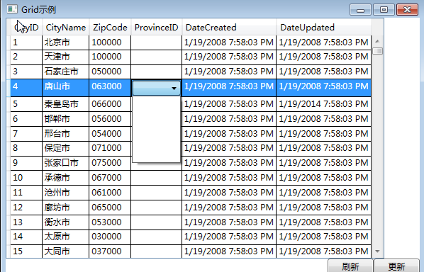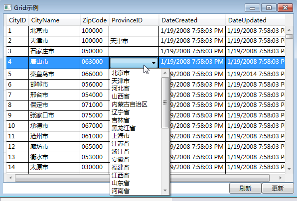 2) 对“Grid示例”的窗口界面中,第一行的ProvinceID进行修改,在下拉框中选择“内蒙古自治区”。