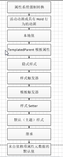 通过前面的简单介绍,我们了解了简单的依赖属性,每次访问一个依赖属性,它内部会按照下面的顺序由高到底处理该值。详细见下图