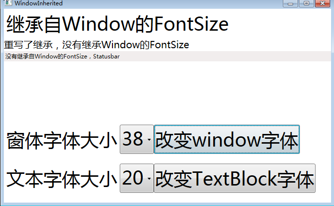 Window.FontSize 设置会影响所有的内部元素字体大小,这就是所谓的属性值继承,如上面代码中的第一个Label没有定义FontSize ,所以它继承了Window.FontSize的值。但一旦子元素提供了显式设置,这种继承就会被打断,如第二个TextBlock定义了自己的 FontSize,所以这个时候继承的值就不会再起作用了。