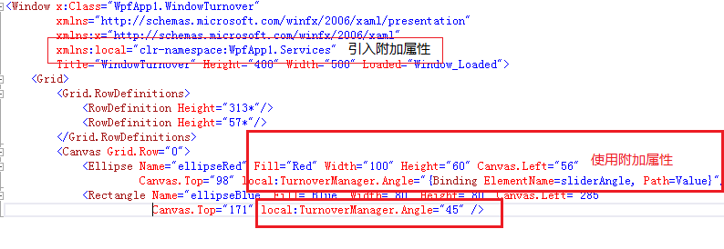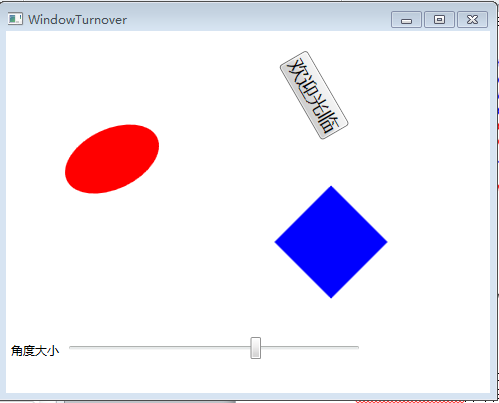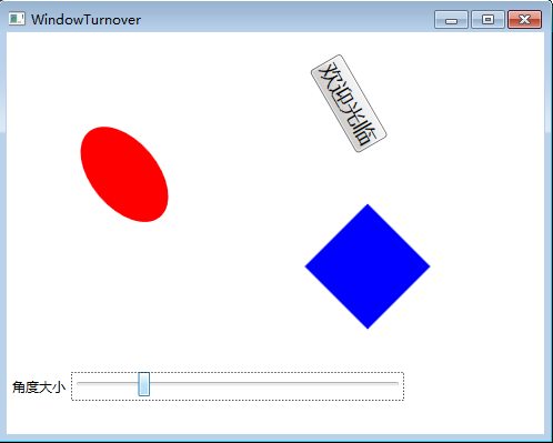 <Window x:Class="WpfApp1.WindowTurnover" xmlns="http://schemas.microsoft.com/winfx/2006/xaml/presentation" xmlns:x="http://schemas.microsoft.com/winfx/2006/xaml" xmlns:local="clr-namespace:WpfApp1.Services" Title="WindowTurnover" Height="400" Width="500" Loaded="Window_Loaded"> <Grid> <Grid.RowDefinitions> <RowDefinition Height="313*"/> <RowDefinition Height="57*"/> </Grid.RowDefinitions> <Canvas Grid.Row="0"> <Ellipse Name="ellipseRed" Fill="Red" Width="100" Height="60" Canvas.Left="56" Canvas.Top="98" local:TurnoverManager.Angle="{Binding ElementName=sliderAngle, Path=Value}"/> <Rectangle Name="ellipseBlue" Fill="Blue" Width="80" Height="80" Canvas.Left="285" Canvas.Top="171" local:TurnoverManager.Angle="45" /> <Button Name="btnWelcome" Content="欢迎光临" Canvas.Left="265" Canvas.Top="48" FontSize="20" local:TurnoverManager.Angle="60"/> </Canvas> <WrapPanel Grid.Row="1"> <Label Content="角度大小" /> <Slider x:Name="sliderAngle" Minimum="0" Maximum="240" Width="300" /> </WrapPanel> </Grid> </Window>