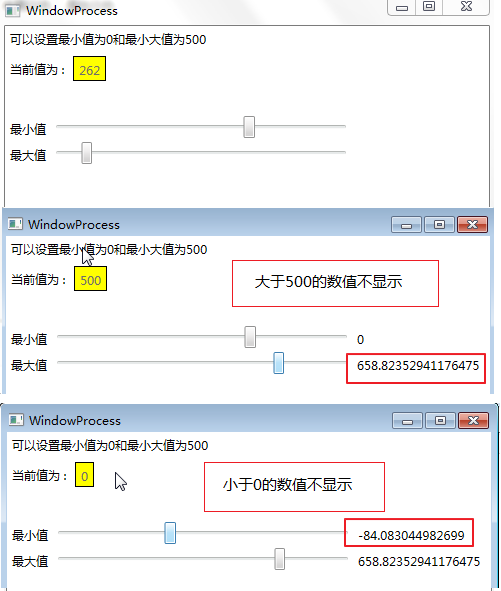 <Window x:Class="WpfApp1.WindowProcess" xmlns="http://schemas.microsoft.com/winfx/2006/xaml/presentation" xmlns:x="http://schemas.microsoft.com/winfx/2006/xaml" xmlns:local="clr-namespace:WpfApp1.Controls" Title="WindowProcess" Height="400" Width="500"> <Grid> <StackPanel Orientation="Vertical"> <local:MyValiDP x:Name="myValiDP1" MaxValue="500" MinValue="0" /> <Label Content="可以设置最小值为0和最小大值为500" Height="30"/> <StackPanel Orientation="Horizontal" Height="60"> <Label Content="当前值为 : "/> <Label Background="Yellow" BorderBrush="Black" BorderThickness="1" IsEnabled="False" Content="{Binding ElementName=myValiDP1, Path=CurrentValue}" Height="25" VerticalAlignment="Top" /> </StackPanel> <WrapPanel > <Label Content="最小值" /> <Slider x:Name="sliderMin" Minimum="-200" Maximum="100" Width="300" ValueChanged="sliderMin_ValueChanged" SmallChange="10" /> <Label Content="{Binding ElementName=sliderMin, Path=Value}" /> </WrapPanel> <WrapPanel > <Label Content="最大值" /> <Slider x:Name="sliderMax" Minimum="200" Maximum="800" Width="300" ValueChanged="sliderMax_ValueChanged" SmallChange="10" /> <Label Content="{Binding ElementName=sliderMax, Path=Value}" /> </WrapPanel> </StackPanel> </Grid> </Window>