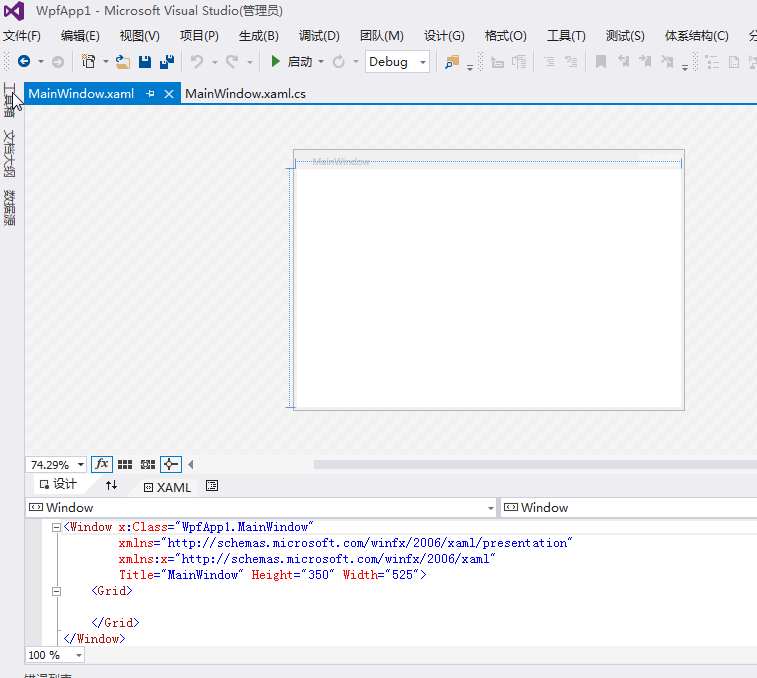 1) 在新建完WPF项目之后,WPF项目中有一个默认界面。如下图。